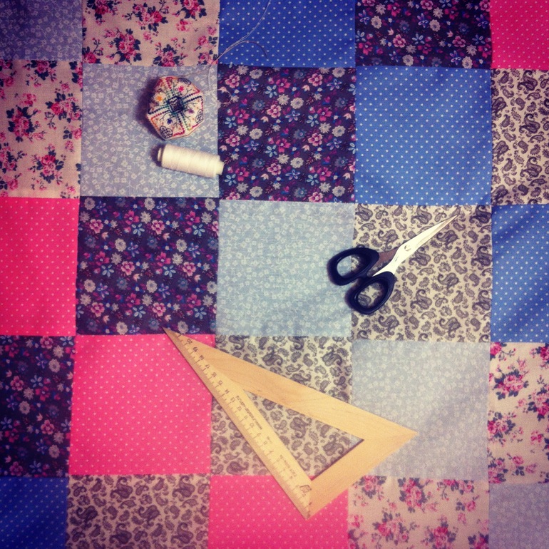 Каждый квадратик 15*15 с припусками. Припуски отдельно не прибавляла, о отступала на пол ширины лапки. Лапка обычная. Ошибка моя была в том, что я не сразу догадалась нарисовать шаблон и по нему кроить, а вымеряла все на ткани, что усложнило работу и многие мои такие квадратики были немного ромбиками.