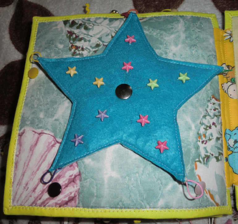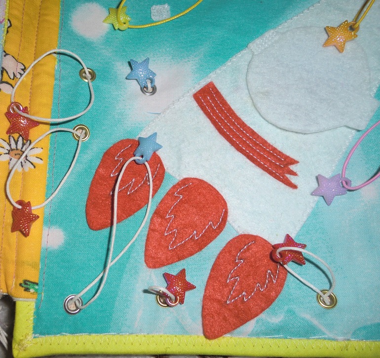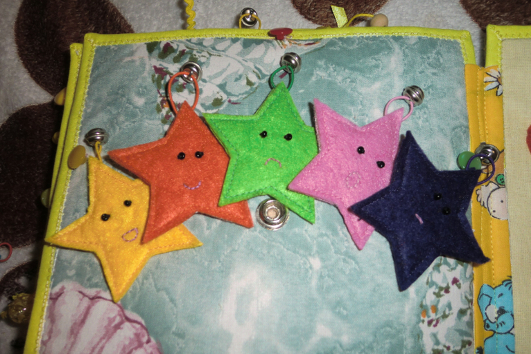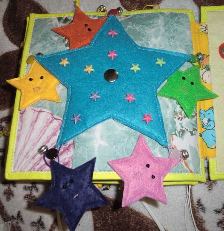 У большой звезды петельки и бусинки разный цветов, нужно одеть на подходящие по цвету пуговки.