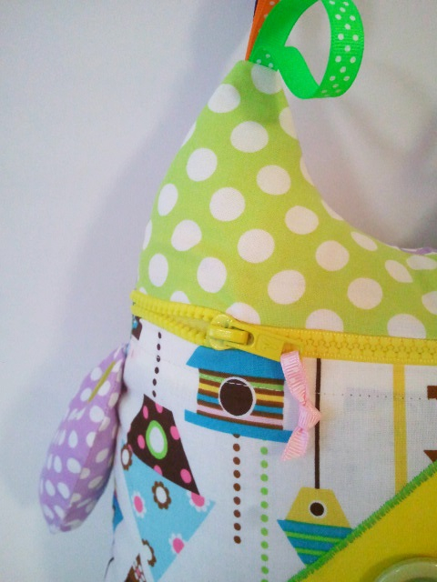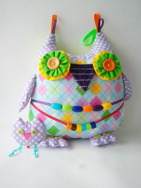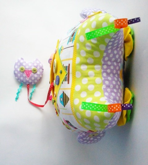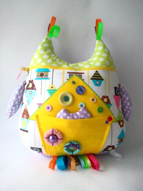 Игрушечный мир - животныеПолучилась вот такая яркая, сочная и немного выбражуля! Две нити бус украшают грудку этой Совушки. На спинке, в "тактильном" домике расположился шелестящий малыш. Клюв на липучке, хвост-ряд ярких лент, в крылышках бусины, и замочек над "жилищем" Совенка))