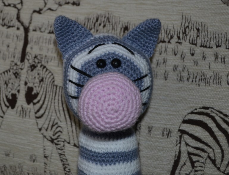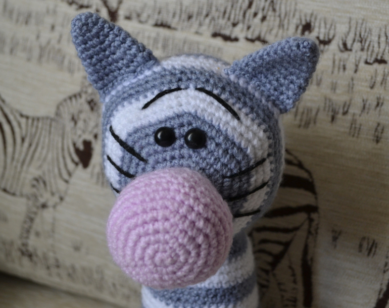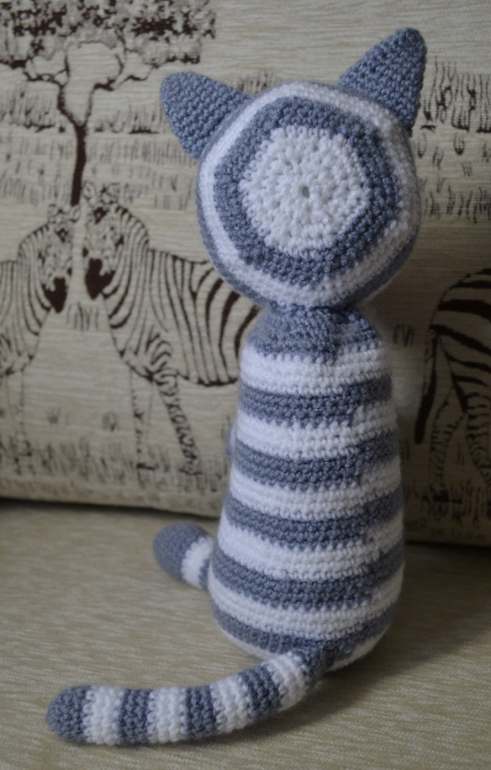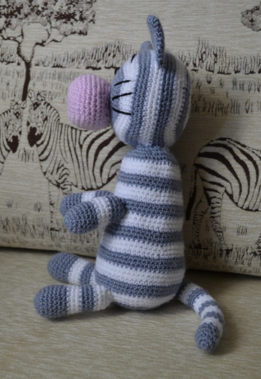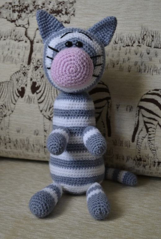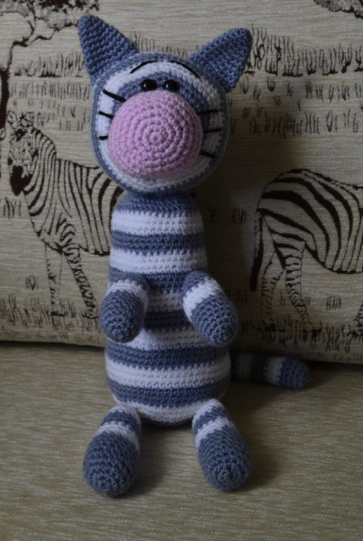Когда его будешь вязать в следующий раз, советую места, где цвет нити меняется, выстроить в одну линию. Тогда надо будет каждый раз по немногу провязывать следующий ряд начатым цветом, доходить до нужного момента, и уже потом менять нить =) так эффектнее будет спинка =) я первого кота вязала, тоже ровно по рядам цвет меняла — на втором начала экспериментировать, и не зря, точно лучше =)