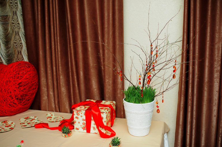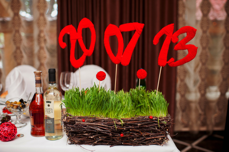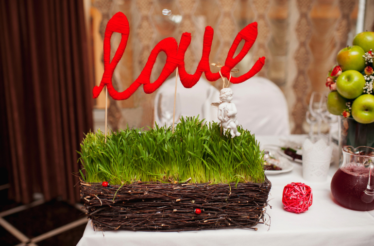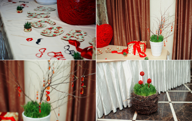 Надпись: «любовь» и дата «20.07.13» и нумерация столов от «1» до «4» (вырезаны из картона, обклеены двойным скотчем и обвязаны красными шерстяными нитками)Шары в зале + Большое сердце: нитки(красные и белые), воздушные шарики, клей пва, крахмал