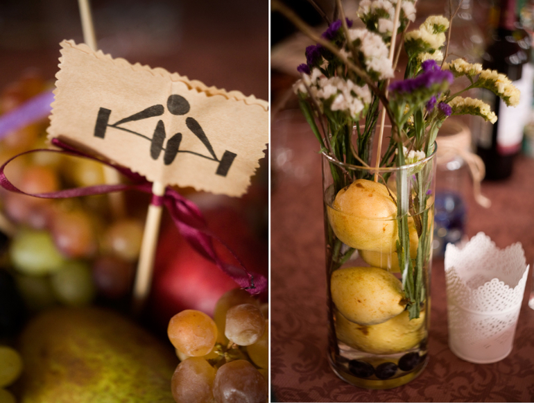 На столах вазы с грушами и цветами тех же оттенков + ветки..