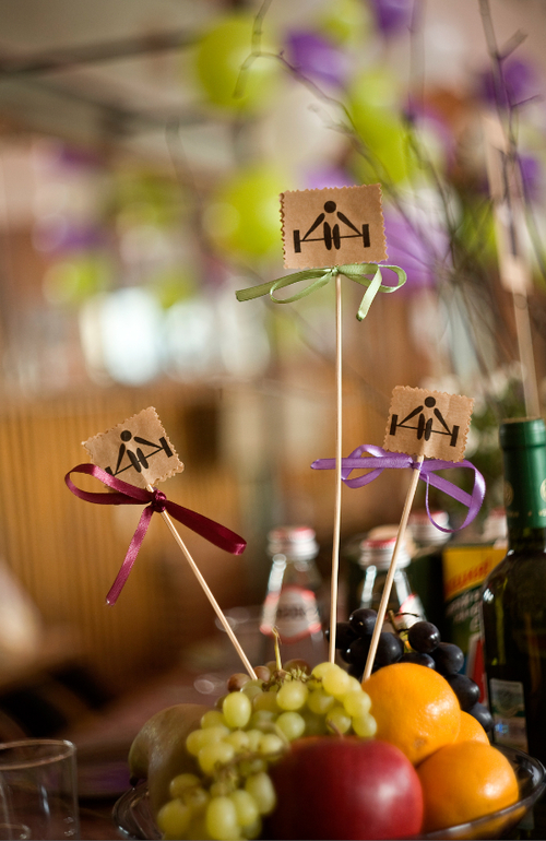 Распечатанные на гофр. бумаге украшения, закрепленные на шпажках со значком "тяжелая атлетика".