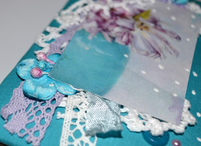Здравствуйте.Хочу показать вам новый блокнот,родился он по вдохновению и очень мне нравится(не скромно)).Бирюзовый и нежно-сиреневый,много кружева и немного акриловой краски.Полностью ручная работа.
