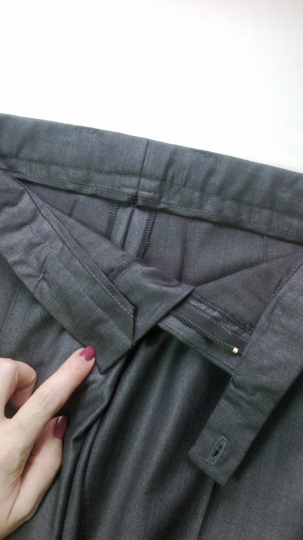 Недавно на фирменных брюках увидела, другой способ. Брючная лента притачивается только на заднюю половину брюк. Концы ленты уходят в припуски шаговых и боковых швов, после эти швы стачивают.