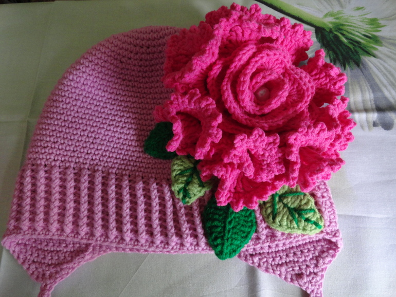 очень красивая и аккуратная работа! не поделитесь схемой или описанием этого потрясающего цветка? серединка понятна, а вот как эти волнистые края получились у цветка на шапке, понять не могу)