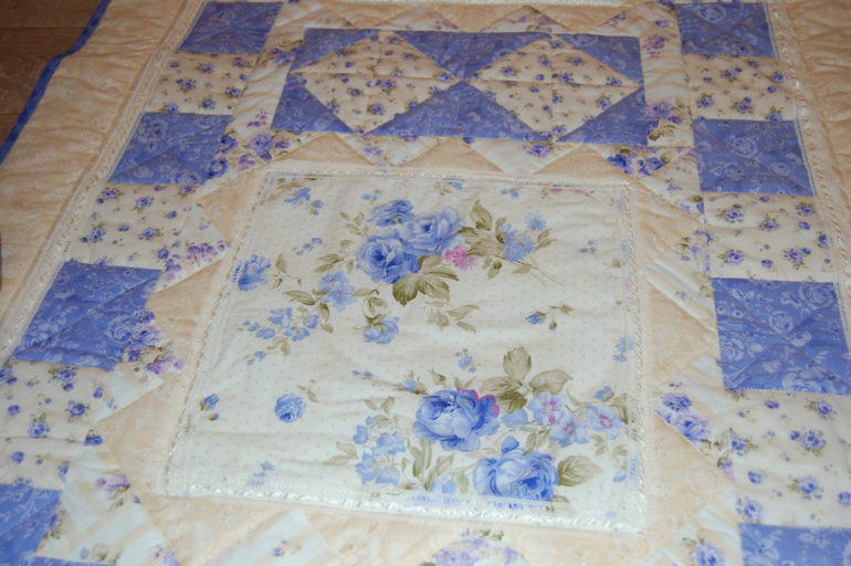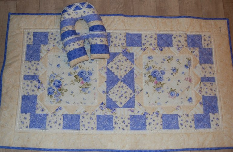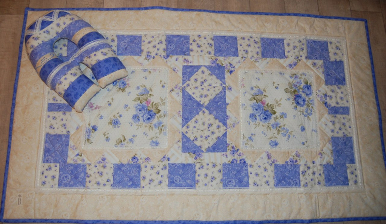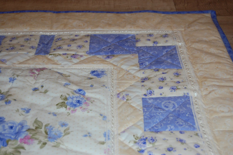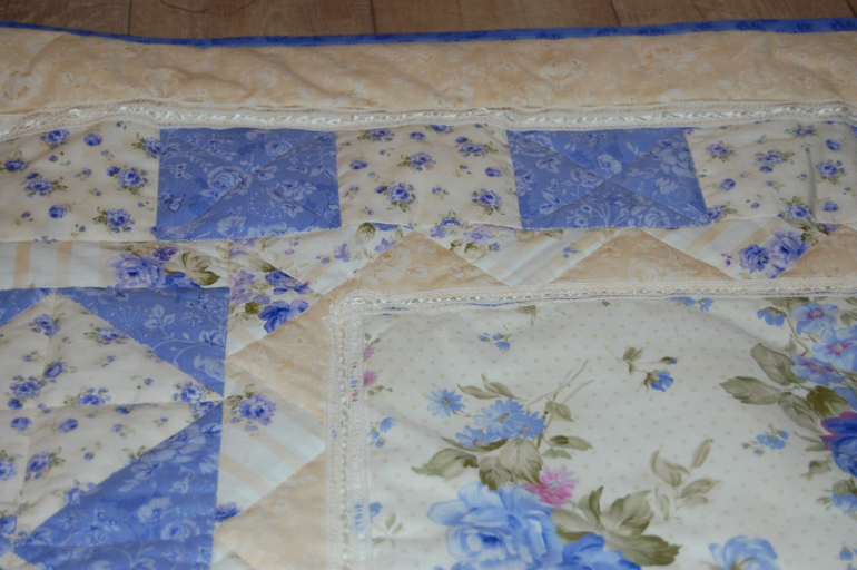 Материал 100% хлопок Америка.Наполнитель,первый раз попробовала,синтепон благодаря которому покрывало выглядит более воздушно.Машинная стежка.
