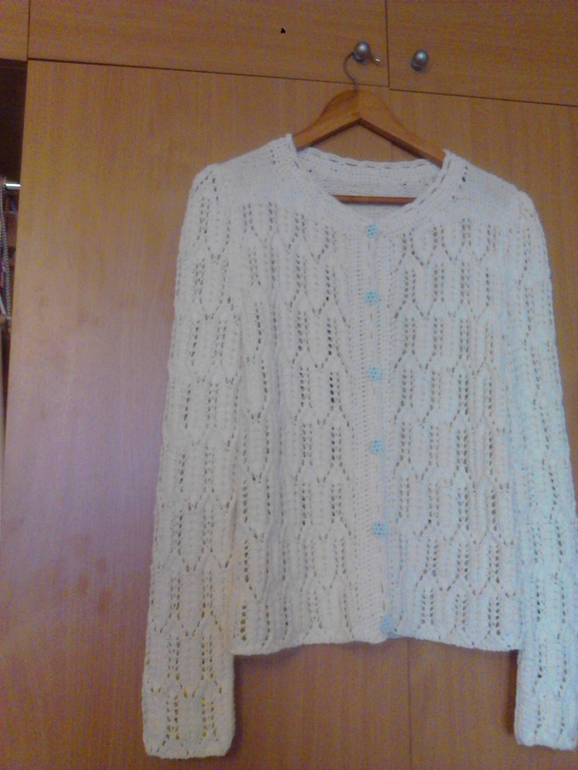 Мне нечего было одеть с платьями и юбками по вечерам, решила что-то летнее быстренько в июле связать и в магазин за пряжей выйти не могла, поэтому выудила из старых запасов Ализе Пуффи (или полиэстер или микрофибра - не помню, не предел мечты, но на ощупь очень мягкая).