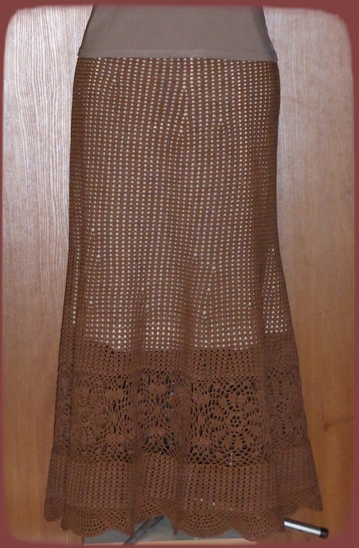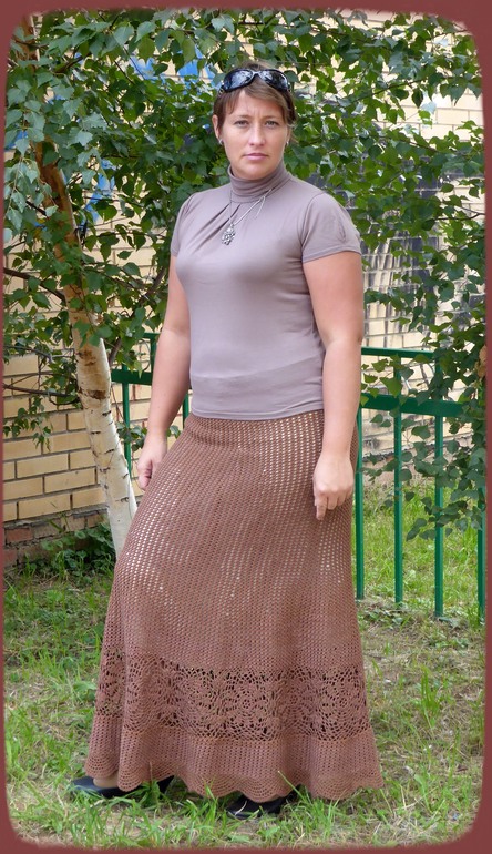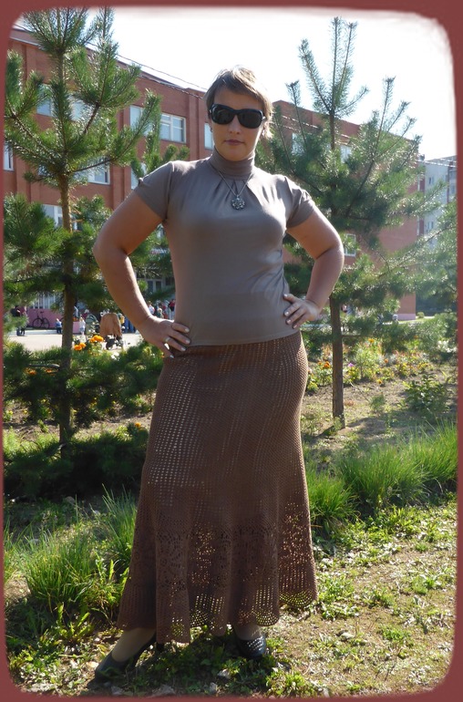 Пошла в магазин и зацепил меня этот цвет(4306) в пряже "СOCO". Вот и получилась у меня юбка "Шоколадное настроение". Вчера вшила подклад на широкую коричневую резинку, а сегодня я её и "выгуляла". Самой нравится аж жуть, некоторые прохожие косились, некоторые даже подходили спрашивали:"Сама ли я её сделала или купила?".