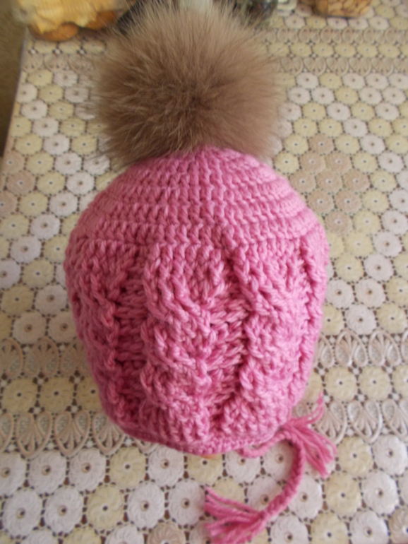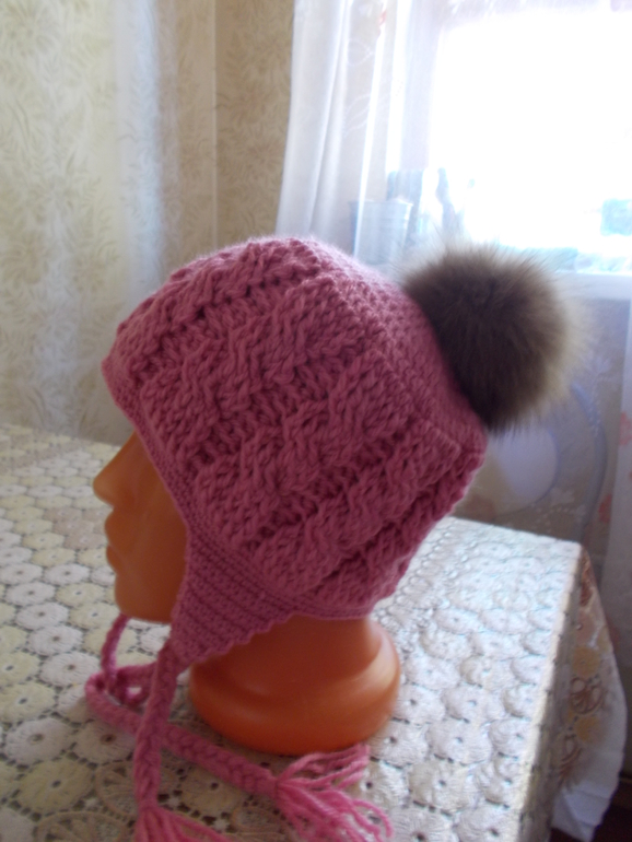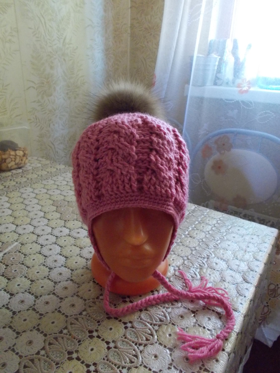 нее, она там с ушками))в самом конце показано как ушки вязать.)просто там снизу вверх и с убавлениями, а у меня- круглая макушка с прибавками , а потом косы) и да ,крючком)