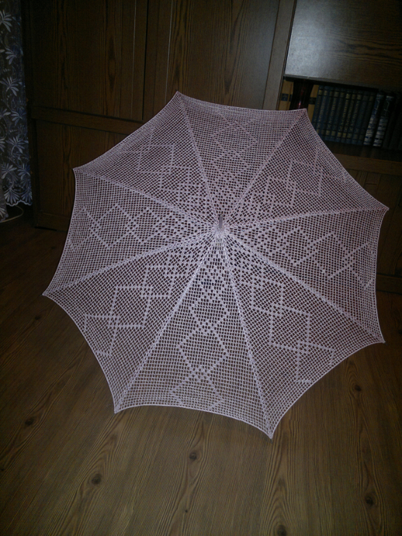 Какая красотень!!! Сколько сама порывалась связать зонт маме в подарок,так и не решаюсь. теппрь нескоро решусь. Мой максимум это палантин на вилке. Правда маме ооооочень понравился.