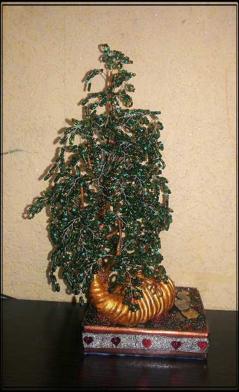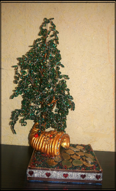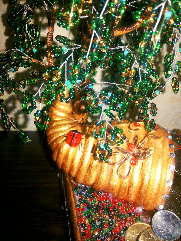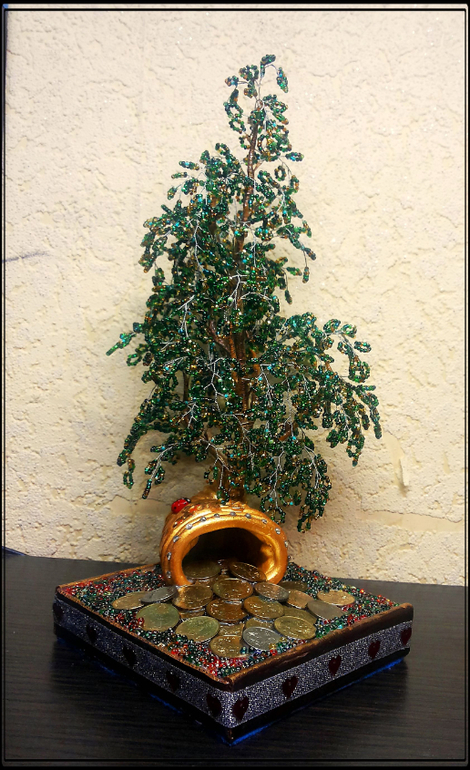 Бисер. Бисероплетение. Украшения из бисера.Пришлось повторять предыдущую задумку под заказ уже. Дерево получилось высокое - 29 см., остальное - рог из пластика, монетки - десятикопейки и копеечки. Итак - милости просим к просмотру))