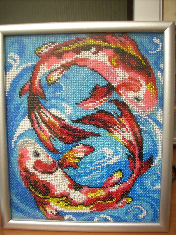 Мне кажется, что плавники рыб упираются в раму. Нужно немного отделить.А сама работа классная. Мне понравилась. Этим летом в Адлере кормили таких карпов в океанариуме.