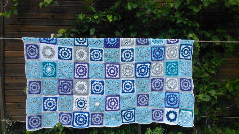 Итоговый размер 175 на 145 см, 11 на 9 квадратов. Пряжа Нако атлантик, Вита Долли в две нити и остатки мохеров в две нити. Крючок №3,5.