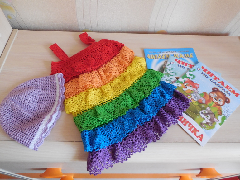 Сегодня получили посылочку от рукодельницы Елены. В обмен на парящую чашечк Лена связала для доченьки чудесный сарафан! Он такой радостный! Смотришь на него и настроение улучшается даже в такую пасмурную погоду, как сегодня!