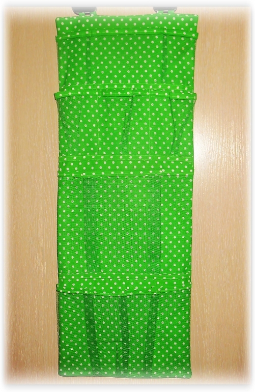 на крючки (которые с двухсторонним скотчем на обороте), и их на дверцу приклеиваю .А на кармашках сверху 2 петли для этого сделаны. Завтра может сделаю фото как наши кармашки в саду выглядят