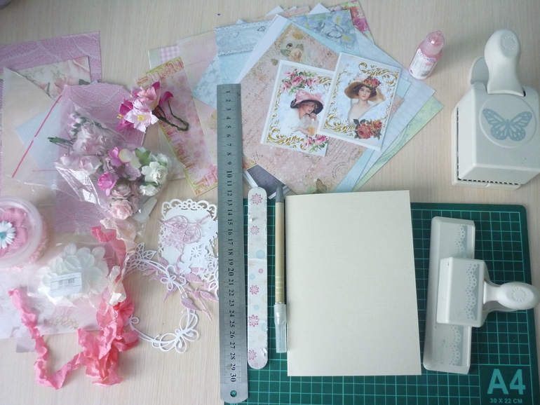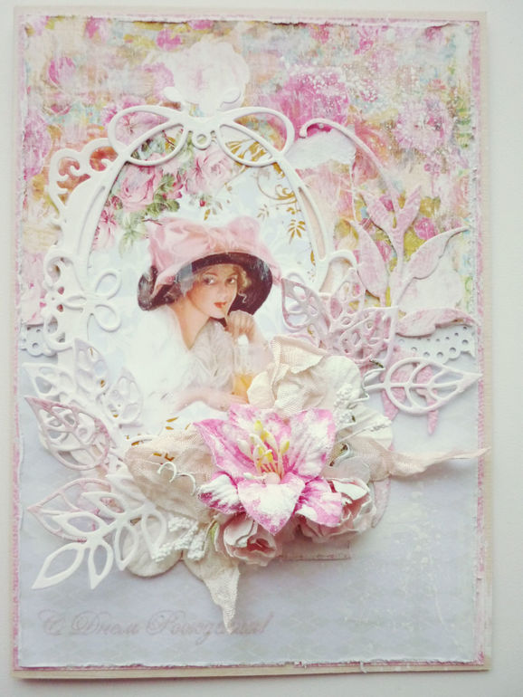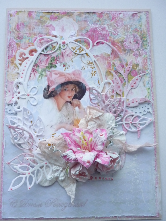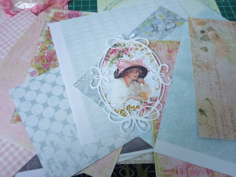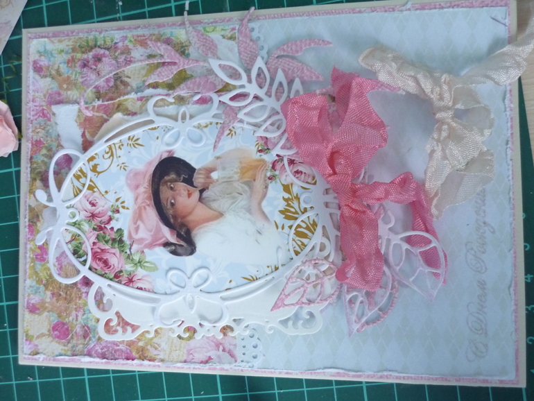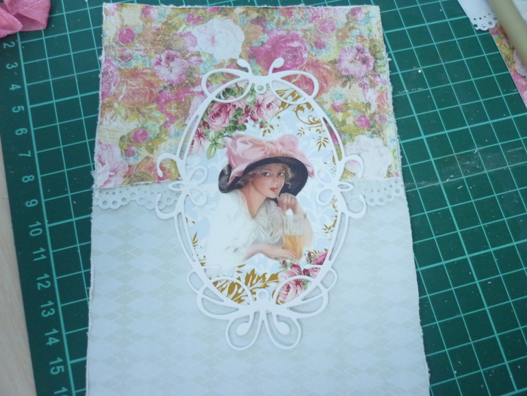 Я все это посадила на основу нежно розового цвета. Примеряем нашу вырубку, шебби ленточку. Ах, да под рамку приклеиваем всякие кусочки скрап.бумаги подходящие под нашу картинку и кусочек от вырубки (для многослойности) Украшаем цветами и листочками