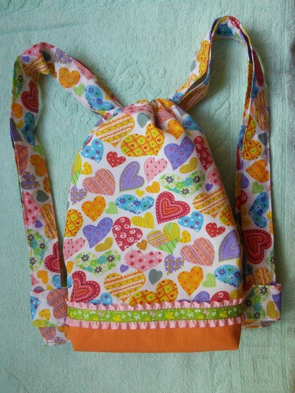 Описание: яркий рюкзачок для малышки. Подойдёт для девочки 2-3 лет. Пошит из корейского хлопка и джинсовой ткани. Затягивается с помощью шлеек.