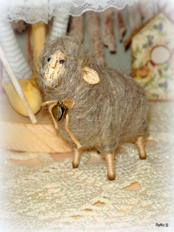 ягненок сделан из мохеровых ниток и проволоки, обмотанной обычными швейными нитками)