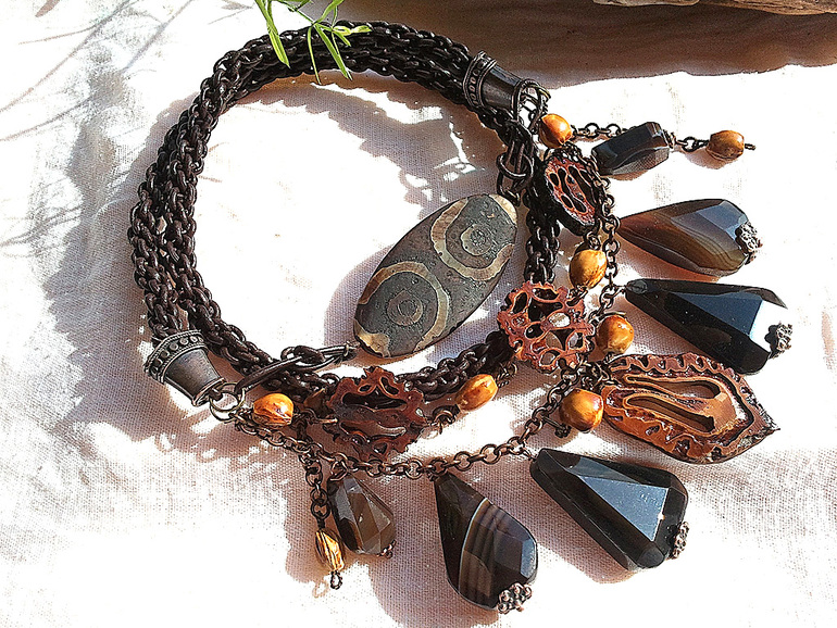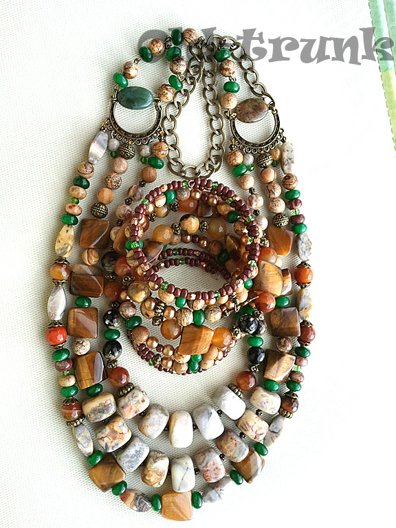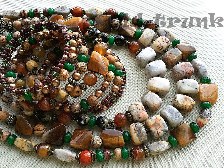 Комплект выполнен из бусин тигрового глаза, яшмы пейзажной, яшмыПикассо, агата, металла, стекла, в браслете присутствует бисер и акрил.