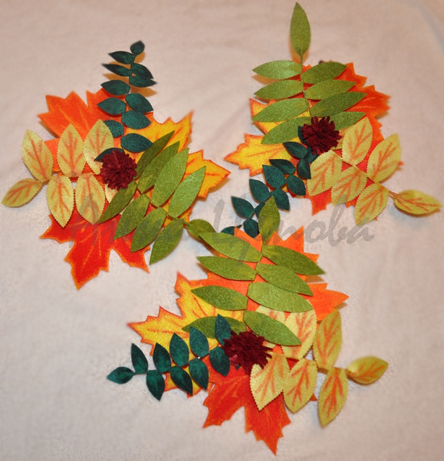 Вот так сегодня поиздевалась эксперементировала над фетром. 3 декоративных букетика для праздника осени в мантессори-классе подруги. Не шила - только клеила и рисовала. Сфотографировала как обычно абы как и абы на чем да еще под утро - для приличия мятый фон в фотошопе размазала