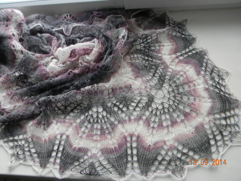 Первую видела уже — красота) а вторая еще краше! Нежная для мамочки =) я тоже попозже из крашеной сегментами пряжи буду пробовать эту шаль, а то однотонные уже приелись =)