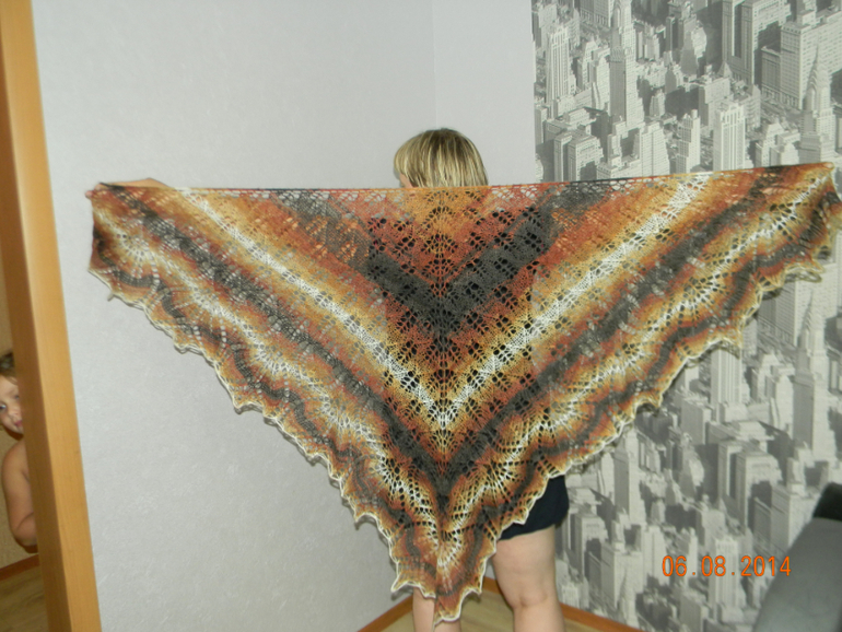 Юляш, красота! У меня руки до второй шали так и не дошли)) Мне твоя вторая расцветка очень понравилась. Нитки те же?