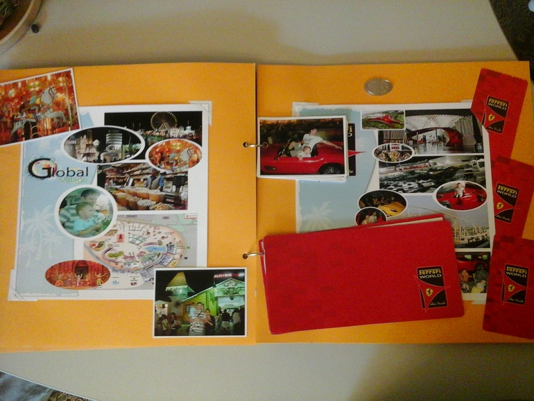 далее коллаж о посещении Глобал Виллидж - ярмарки, где мы перепробовали все сладости)) и коллаж о развлечениях в Феррари-парке: к фото прилагаются билеты, карта парка и отчеканенная нами в спецавтомате монетка на память.