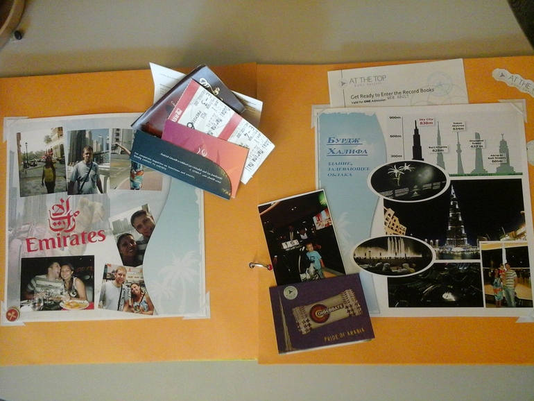 второй разворот - наши прогулки по городу, билетики в кино, на 124-й этаж Бурдж Халифы и фото уменьшенные и сложенные в кармашек.