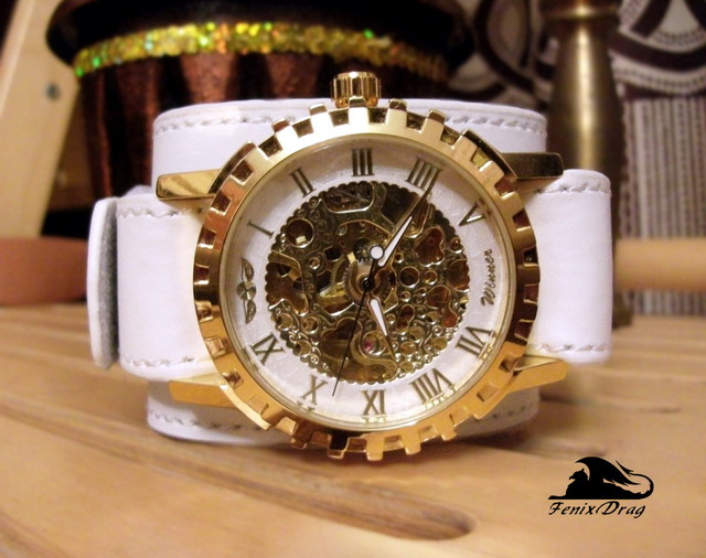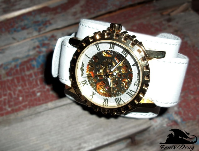 Широкий белый кожаный браслет с механическими часами "Lestanta" в стиле Стимпанк / Steampunk