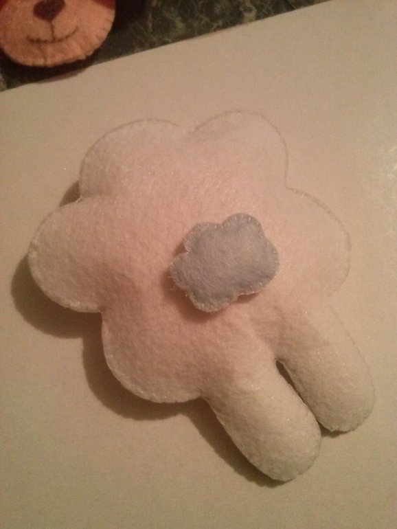 Берем так называемую "прическу" и сшиваем только сверху от края до края. Кладем через низ немного синтепона и вставляем голову, можно опять капнуть каплю клея на лоб нашей овечки чтобы "причесон не ездил" и аккуратно пришиваем к голове. Или оставляем так, но тогда надо обработать края фетра спереди и сзади.