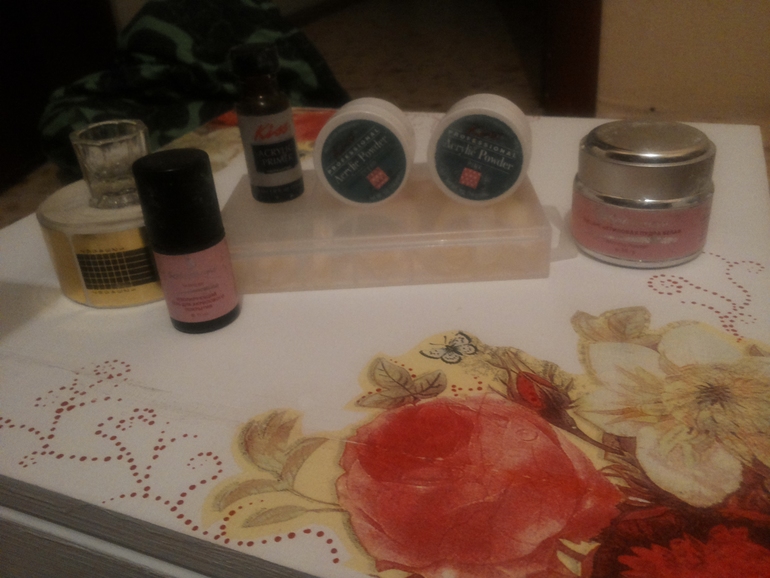 Может кто хочет ропробовать наращивать ногти акрилом, а может для лепки подойдет: праймер акриловый, акрил белый плотный, акрил прозрачный, акрил розовый (вроде прозрачный). А так же коробочка с типсами ( может потренироваться в рисунках на ногтях,) подставки-пальцы для наращивания, глянец гель для акрила, формы ... вроде все...