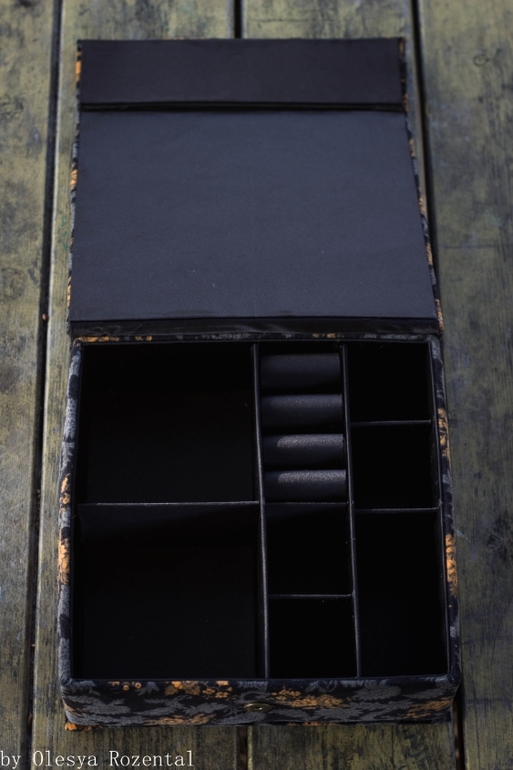 Предназначалась она мне,но ее заприметила свекровь,пришлось дарить =)Был у меня большоооой отрез бархата и кусман черного атласа,размер взяла 30х30,себе ж любимой делала =) Верхушку украшала уже учитывая предпочтения свекрови. А еще так как дома у меня есть помошник(наглый кот),который вечно ворует с моего рабочего стола цветочки,бусинки и брадсы...короче спер он магнитную застежку,пришлось фотографировать без нее,в последствии нашла ее в последний момент под холодильником =) К слову мои украшения все еще хранятся в коробке из под чая =))) правда она в виде шкатулки сделана,но все равно стыд и позор мне =)))
