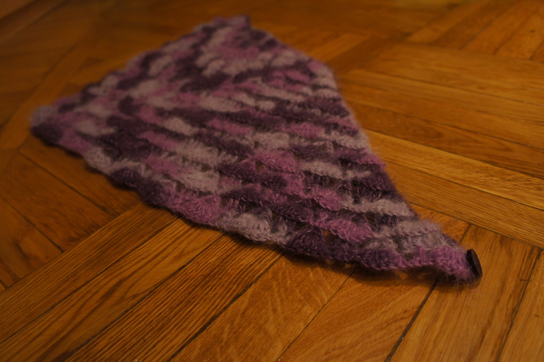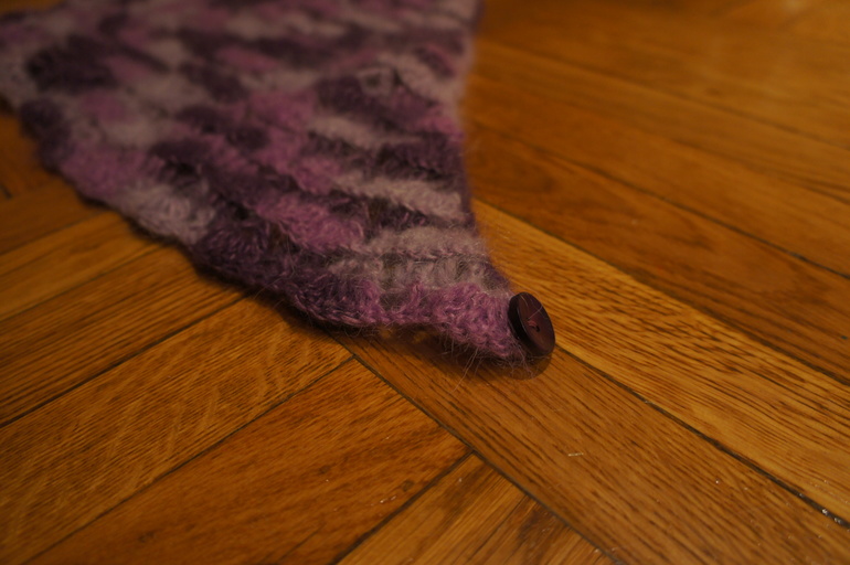 Бактус получился небольшой - как раз, чтобы укутать нежную шейку от промозглого ветра и непогоды. Застегивается на пуговицу.