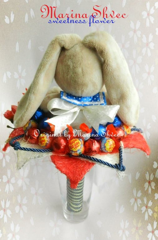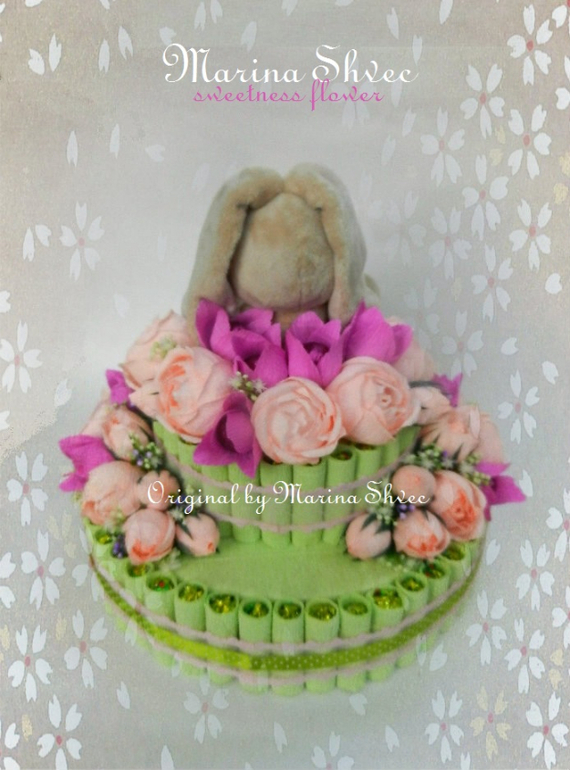 Привет! Марина, красота опять! Букетик очень стильный! Про тортик, на мой взгляд вперед банты, сзади цветы или бусы.
