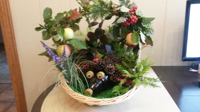 Самая большая поделка Ёж в корзине с дарами природы! Взяли корзину,украсили тем,что растёт на нашем участке:Туя,рябина,яблоки,вьюн,ирга,на дно корзины постелили искусственный газон,украсили искусств.травкой и цветами,а ежа сделали из пивной бутылки,шишек,пробок,добавили глазки и ВОТ!)))Теперь ждём оценок!Спасибо,что всё посмотрели,прочитали и....надеюсь вам понравилось!)))