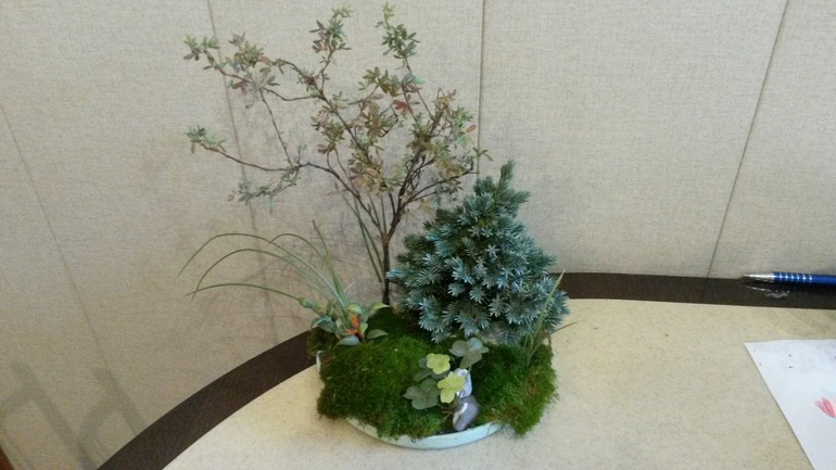Кусочек пригорка(материалы:поддон,мох,веточка от декоративного кустарника,которая заменила нам деревце,камни,можжевельник и искусственная травка)