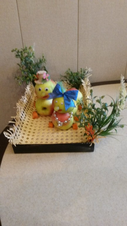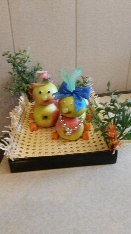 Сладкая парочка))) Поделка из яблок(гусеницы)Взяли коробку,Выстелили рогожку так сказать,украсили искусственными цветами и травкой,туловища из яблок,ноги из моркови на зелёной проволоке,глазки,носы из винограда,шляпа из мешковины,бантик из ленточки,крепили на серебристую проволоку,волосики у "девочки"стриженая грива))))(отстригли у поняшки дочиной))))бусы на нитке.