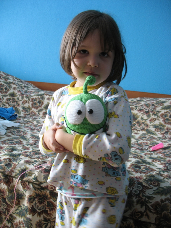 Это моя первая игрушка крючком, так что ошибки есть, куда же без этого. Но главное ребенку нравится. Я вообще не очень люблю, когда мои вязаные игрушки лежат без дела. Обожаю когда они нужны: их носят, целуют, играют с ними, пачкают.)))