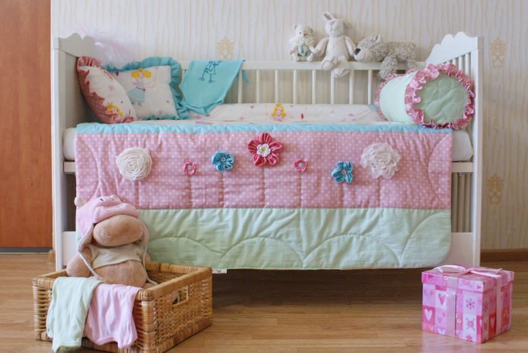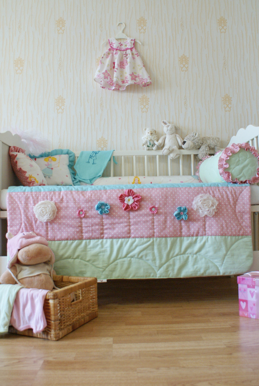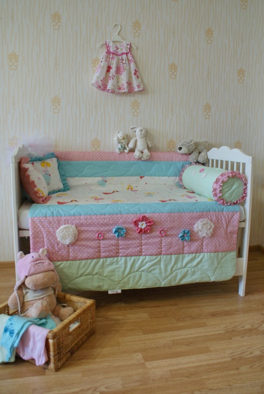 Первый вариант больше яркий и озорной с темой домиков, цветов и бабочек, а второй спокойных пастельных тонов, серый, голубой, розовый, салатный и тема облаков)))
