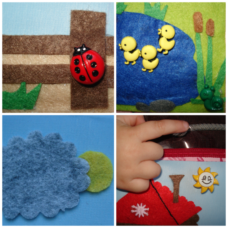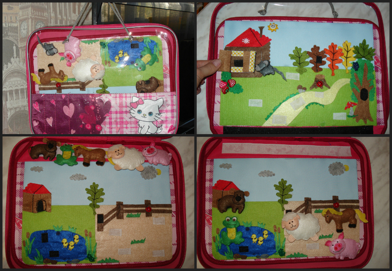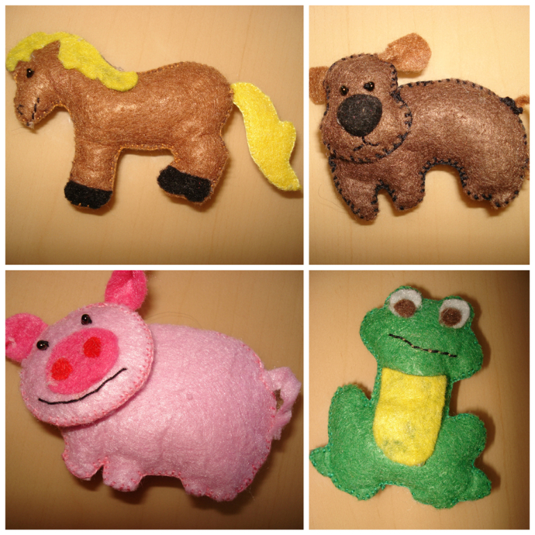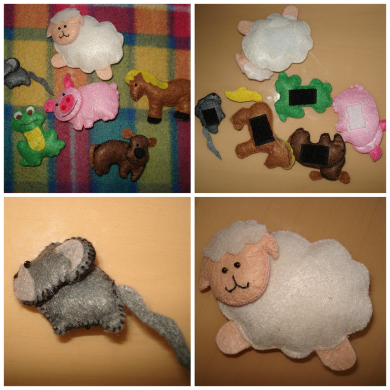 А пока есть 6 животных (на липучке) - мышь, овечка, хрюшка, собака, лягушка, лошадь. Была изначально еще и кошка, но я ее запорола, когда шила на машинке. Поэтому все сделано вручную (абсолютно все!). Что ж, исполнение некоторых животных, да и нескольких деталей оставляет желать лучшего. Но я думаю все равно поиграть сойдет!