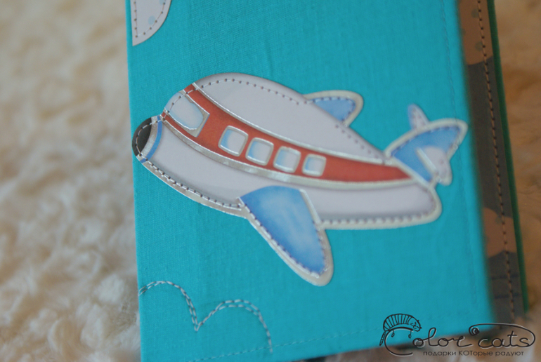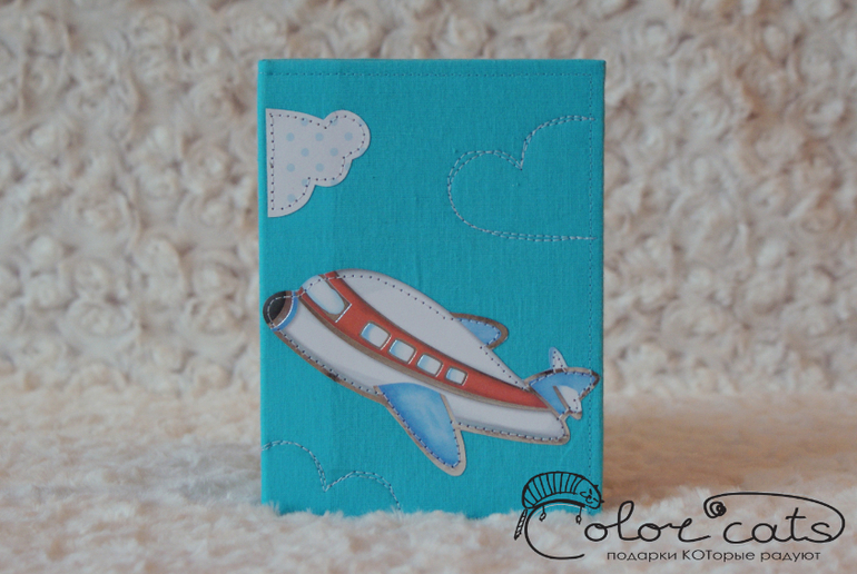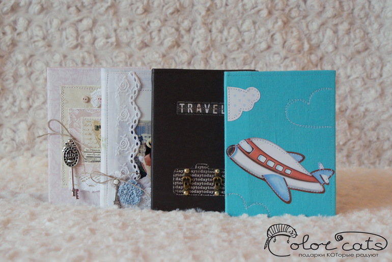 Обложка с чемоданом для папы, с самолетом и героем из мульта "Мусти - Полет" для сына, с Парижем для дочери и шеббистая для самой Олеси))))