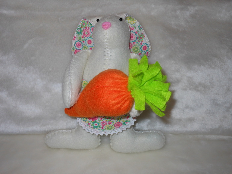 Я давно восхищаюсь работами рукодельниц, которые делают игрушки Тильда. Особенно нравятся зайки) И очень мне хотелось сшить такую зайку, но только из фетра, так как я страдаю фетрозависимостью в глубокой стадии))) В общем, вот, что у меня получилось. Прошу оценить)))