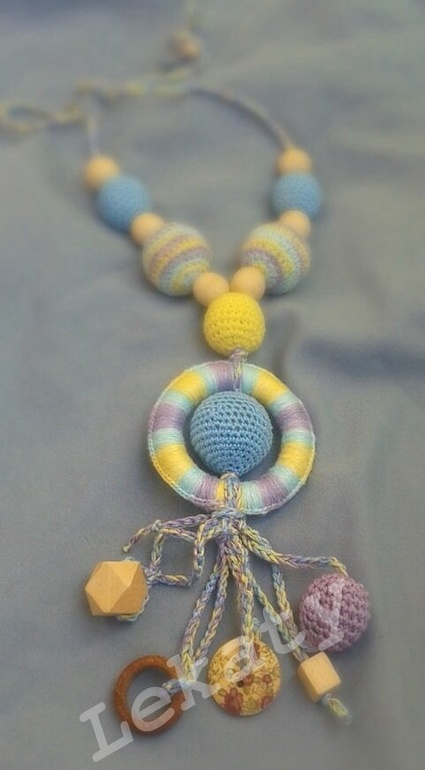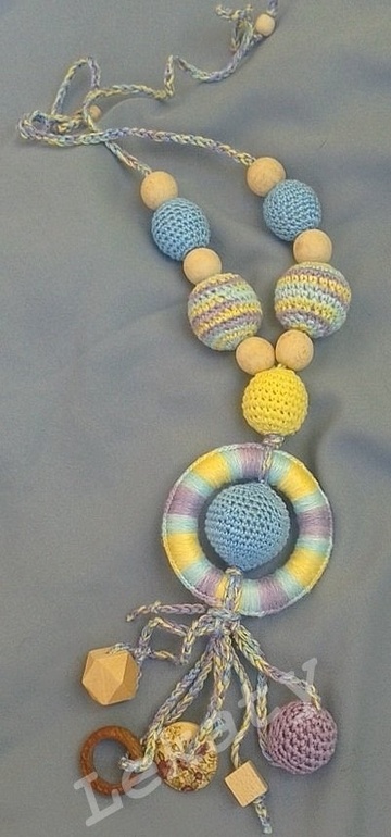 Бижутерия для слингомам. Слингобусы. Грызунки.Вот такие бусинки-кулончик связались на заказ. Общая длина с учетом кисточки 51 см, бусинам часть с кисточкой 29 см, длина регулируется завязками, бусина в колечке гремит. Материалы: деревянные элементы, хлопок 100%, лен 100%. Вязались под вот этот рюкзачок ( фото под катом), но с условиями, чтоб гармонично сочетались не только с рюкзаком, но и повседневной одеждой мамочки)