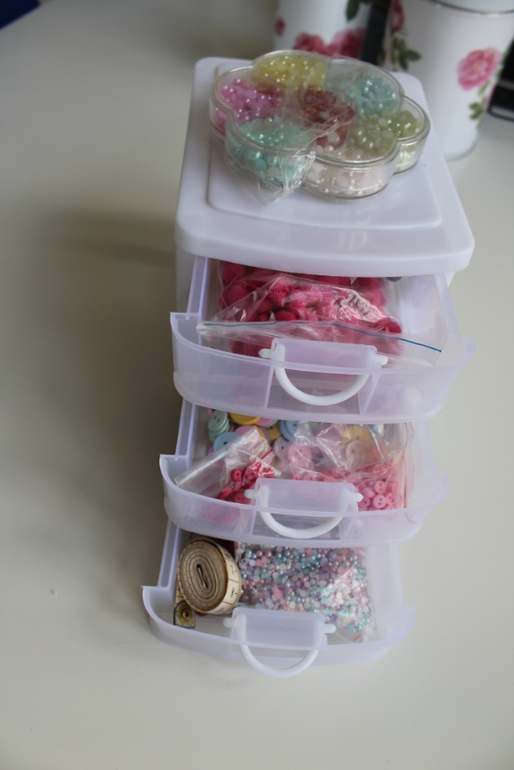 Пластиковый мини-комодик хранит в себе тесьму с помпошками, пуговки цветные, полубусины и бусинки.