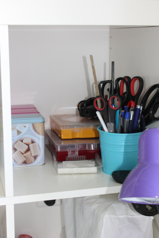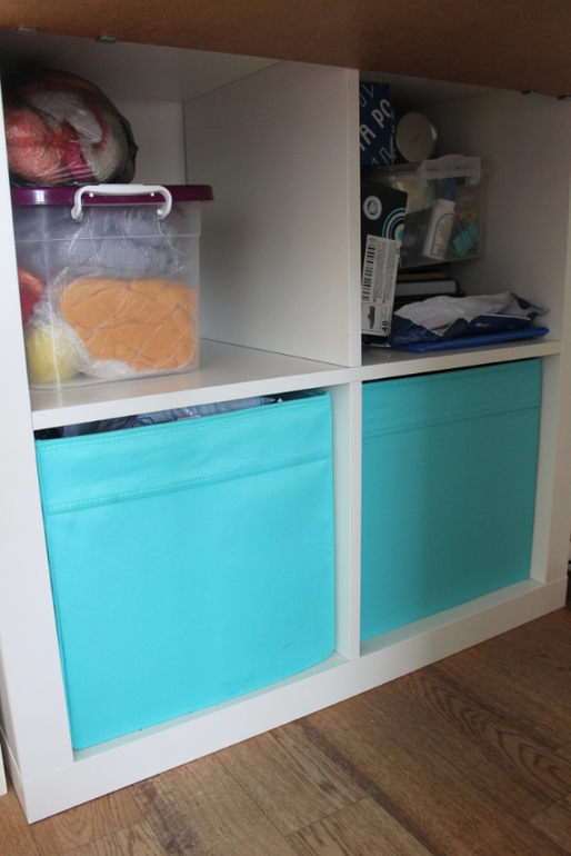Под столом уже не так интересно: коробки с шерстью, канцтовары, в бирюзовых - шары пенопластовые и холлофайбер.