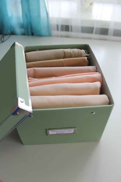 Коробка с тканями для тела кукол: трикотаж и хлопок.