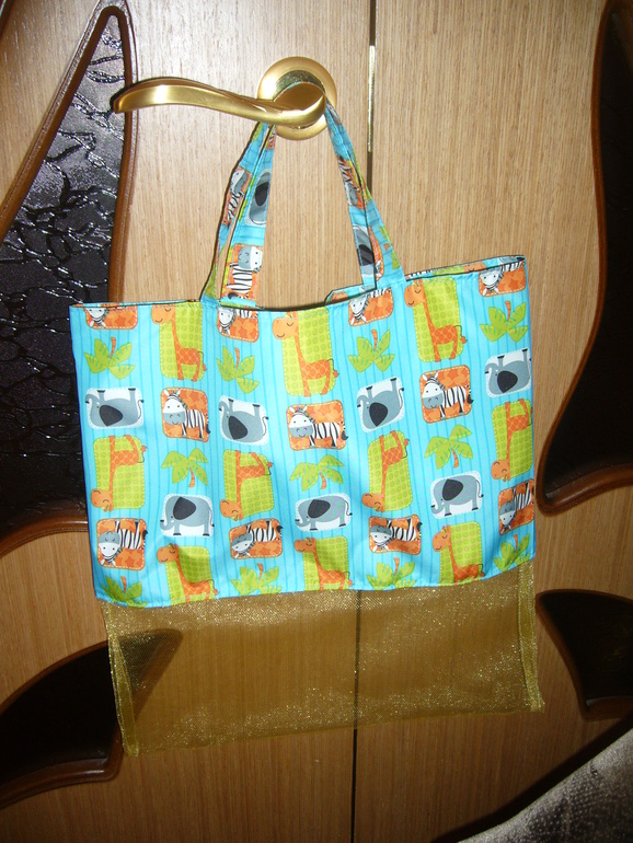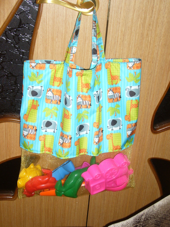 Да идея не нова))),такие сумочки уже давно здесь шьют.Задумано что пока идешь домой из песочника весь песочек из сумки вываливается через сетчатое дно через дырочки)))).