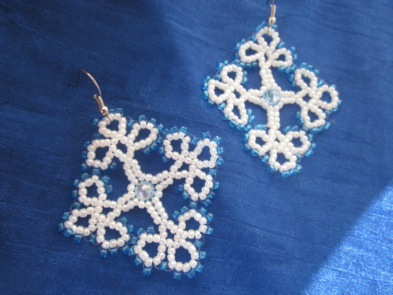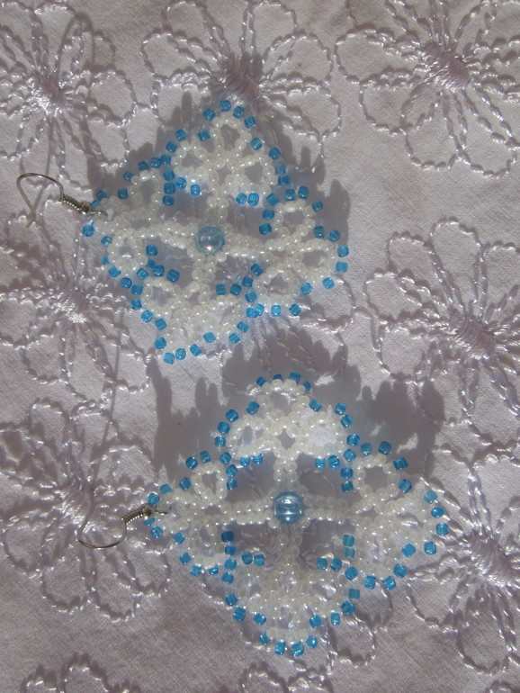 Бисер. Бисероплетение. Украшения из бисера.Эти сережки сделала подружке в качестве подарка на день Ангела(ее зовут Татьяна). Знаю что колье она одевает очень редко, думала сплести браслет, но также знаю что у нее тоненькая ручка(намного тоньше, чем у меня). Поэтому сплела ей серьги(также знаю что часто ходит в белом и в джинсовых сарафанчиках - отсюда и цвета).