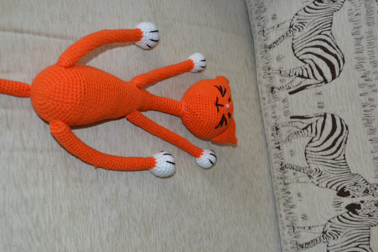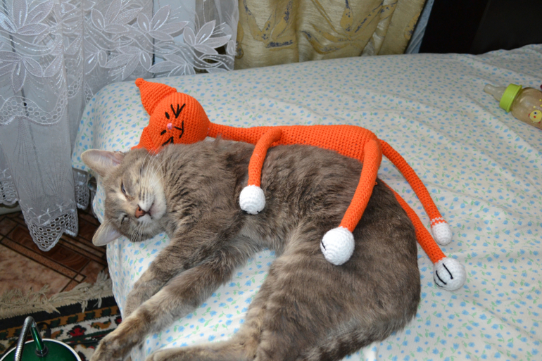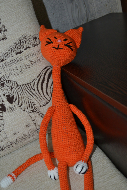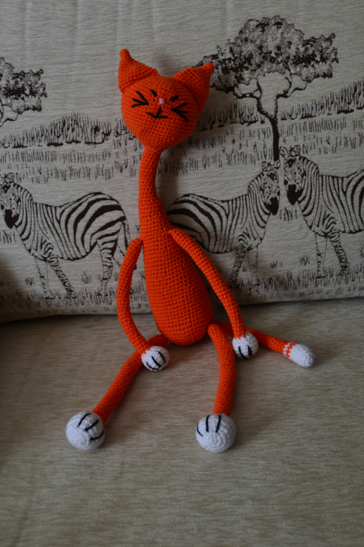 Конечно не жалко. описание авторское ))) описание для этих котиков. у этого пряжа потоньше, и поэтому увеличила количество рядов между убавками.Голова:1р 6п2р пр=123р 1п, пр=184р 2п, пр=245р 3п. пр=306р 4п, пр=367р 5п, пр=428р 6п, пр=489р 7п, пр=5410р 8п, пр=6011-17р = 60п18р 8п, убавка19р 7п, уб и так до 6 петельтуловище1р 6п2р пр=123р 1п, пр=184р 2п, пр=245р 3п, пр=306р 4п, пр=367р 5п, пр=428р 6п, пр=489-20р = 4821р 6п. убавка=42п22р 42п23р 5п, уб=3624-26р =3627р 4п. уб=3028-30р = 3031р 3п, уб=2432-34р =2435р 2п, уб=1836-38р =1839р 1п, уб=1240-50р =12передние лапы:1р =6п2р пр=123р 1п, пр=184-6р =187р 1п, уб =128р 1п, уб=8Длину сама смотриНижние лапы:1р 6п2р пр=123р 1п, пр=184р 2п, пр 245-7р =24п8р 2п, уб=189р 1п, уб=1210р 1п, уб=8 С длинной так жеУши:1р 6п2р столбиком с накидом 6п3р 2п, пр4р 3п, пр5р 4п, пр6р 5п, пр7р 6п, прСмотри сама тоже по длинеХвост:1р 6п2п пр, 12п3-7 12п8р 2п, убдлину сама смотри.Писала сама по памяти, если что спрашивай